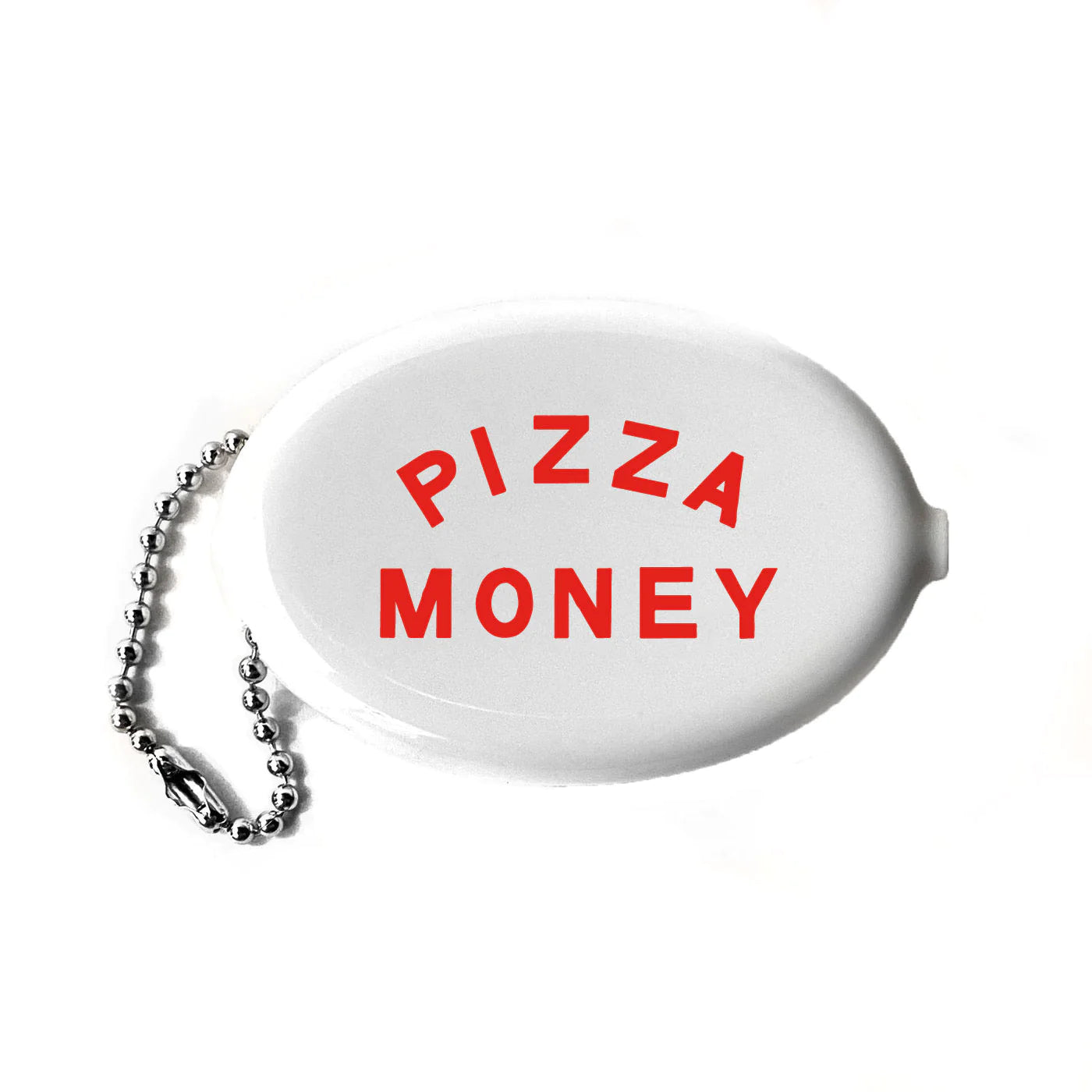 This pouch is white with a sweet vintage-inspired "Pizza Money" message in red.