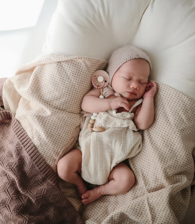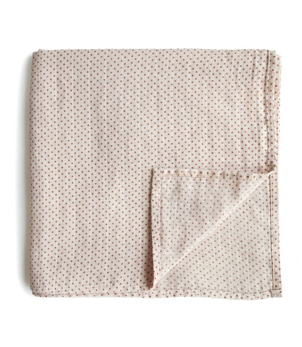 Dainty polka dots cover this soft and breathable muslin swaddle blanket. Lightweight and comforting, this swaddle will keep your newborn cozy and happy, which makes mama happy, too.