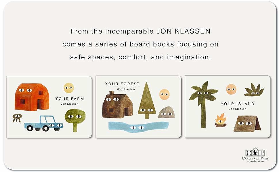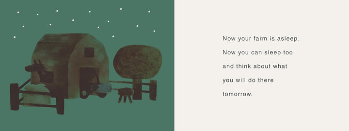 With a minimal tableau of familiar objects and a gentle rhythm suited for reading aloud, a farm and all its items—a horse and its hay, a truck, a stool, a fence—are assembled, ending with bedtime as the sun goes down. This is a farm for a young child to have whenever they want to go there. One in a trio of board books focusing on safe spaces, comfort, and imagination, Your Farm signals both a departure for Jon Klassen and a story whose peculiar touches of whimsy stamp the book as iconically his.
