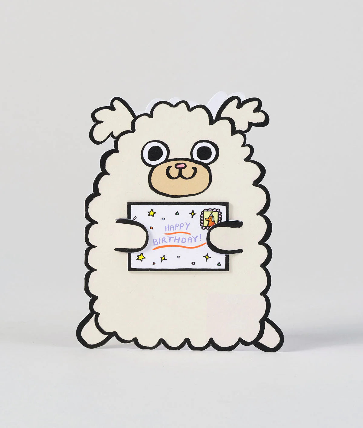 A cute little birthday dog with a small extra card included. This cute fluffy pup is a crowd-pleaser, designed by Alice Bowsher in her fun style