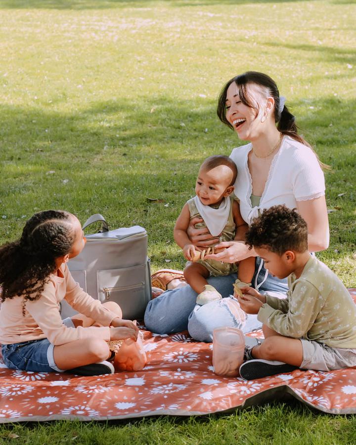 The Bring-It-Everywhere Outdoor Blanket. Designed to handle spills and messes from the park to the beach, the water-resistant, sun baked printed surface wipes clean for quick and easy cleanup. Featuring a compact and foldable structure with a pocket and convenient carrying strap so you can — and should! — bring it everywhere.