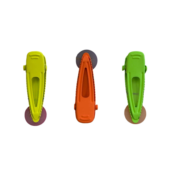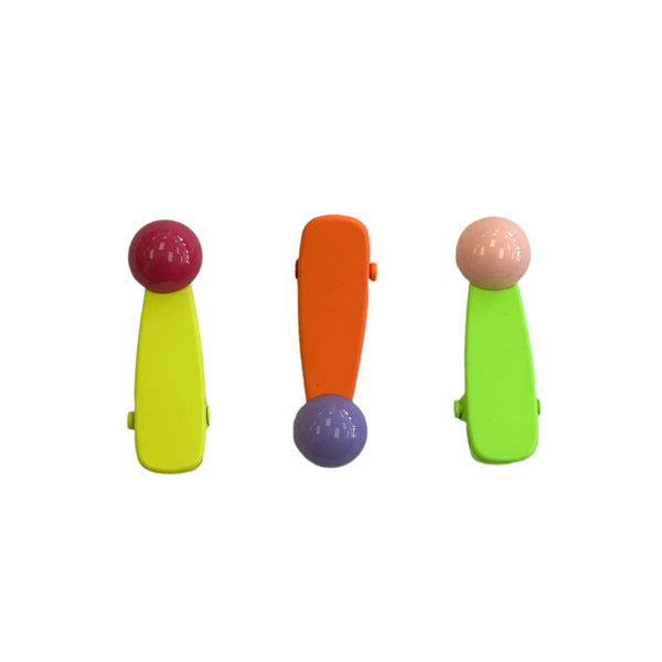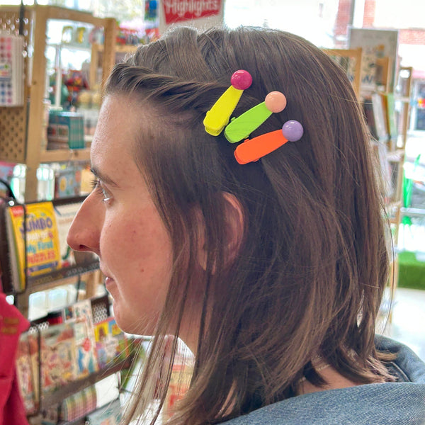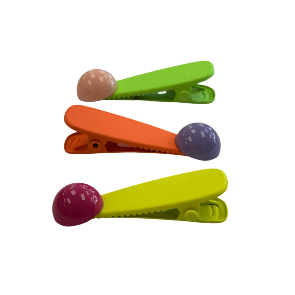 Sweet little hair clips, each adorned with a cute dot, in fun bright colors.