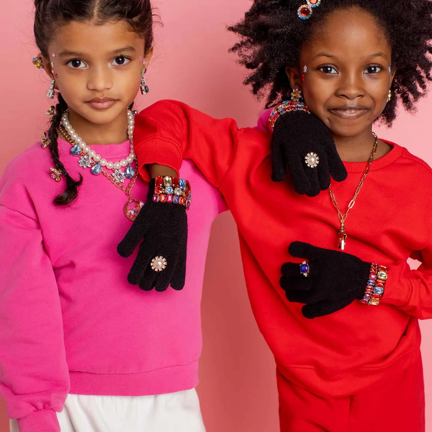 Brrr, time to keep those precious little hands covered! The coziest member of the Super Smalls crew is perfect for everything from ice skating outings, to walks to school, and sipping hot cocoa with pals. Embellished with colorful gemstones, now you can keep your fingers warm and your jewelry popping! Welcome to a winter sparkle-land. Available in one size, recommended fit for ages 4-10 years old.