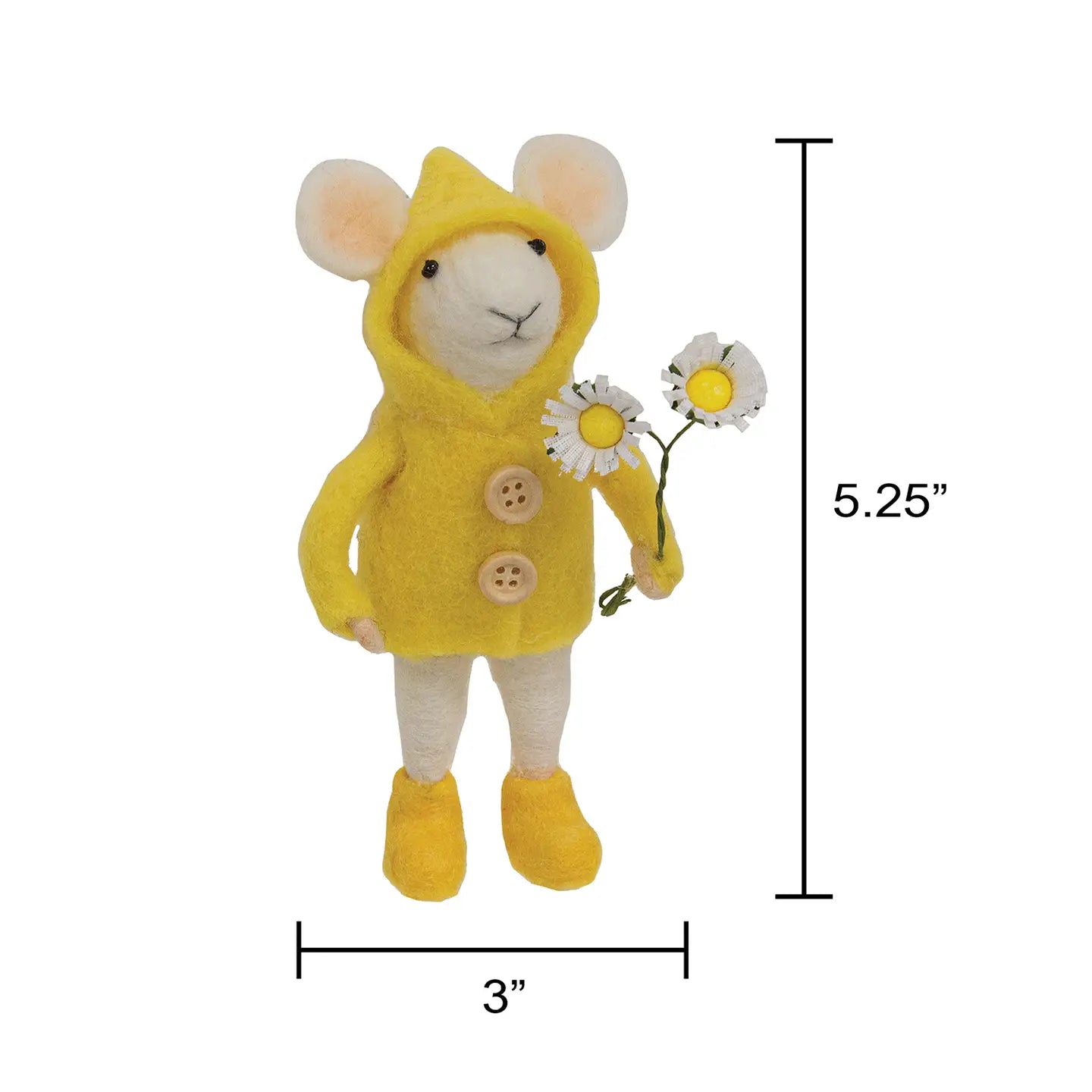 A delightful Mouse in Raincoat Felted Ornament. Ready for a gentle spring shower in its cheerful yellow raincoat with a cozy hood and sweet wooden button details. Matching yellow boots complete the adorable ensemble. Adding a touch of fresh springtime beauty, the mouse gently holds a delicate sprig with two charming white daisies featuring bright yellow centers. Measures 5.25" high by 3" wide.