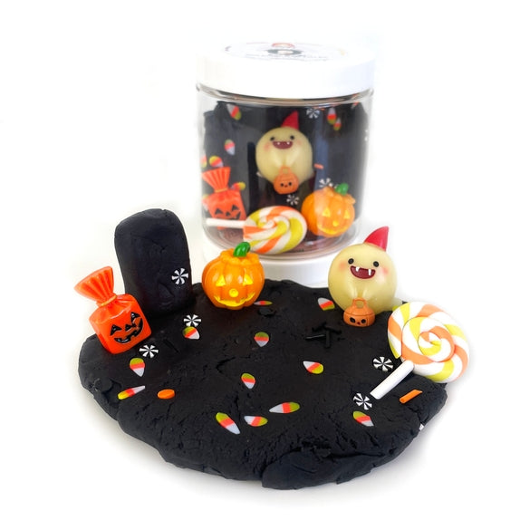 The boo bash mini "dough-to-go" sensory play kit includes a jar half filled with 5 ounces of black cherry scented kiddough, and the other half filled with play pieces- party ghost, candy corn, sucker, and halloween fimos.
