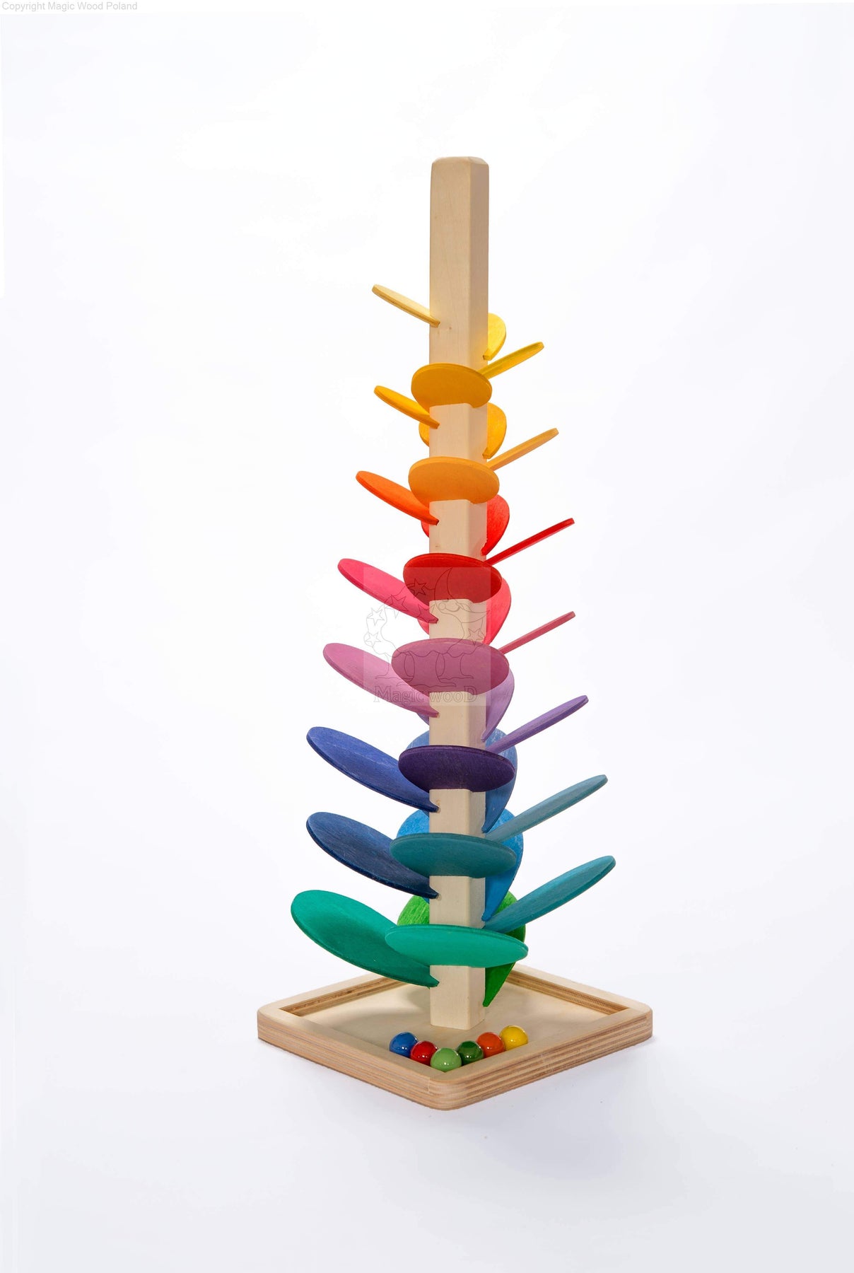 This huge, gorgeous rainbow tree is handmade from solid wood. Drop a marble at the top and watch it spin and roll all the way down the tree, while making the most unique and sweet rain like sounds. Drop all the marbles into the tree at once and watch them race to the bottom! This toy is so simply fun and just amazing to look at!