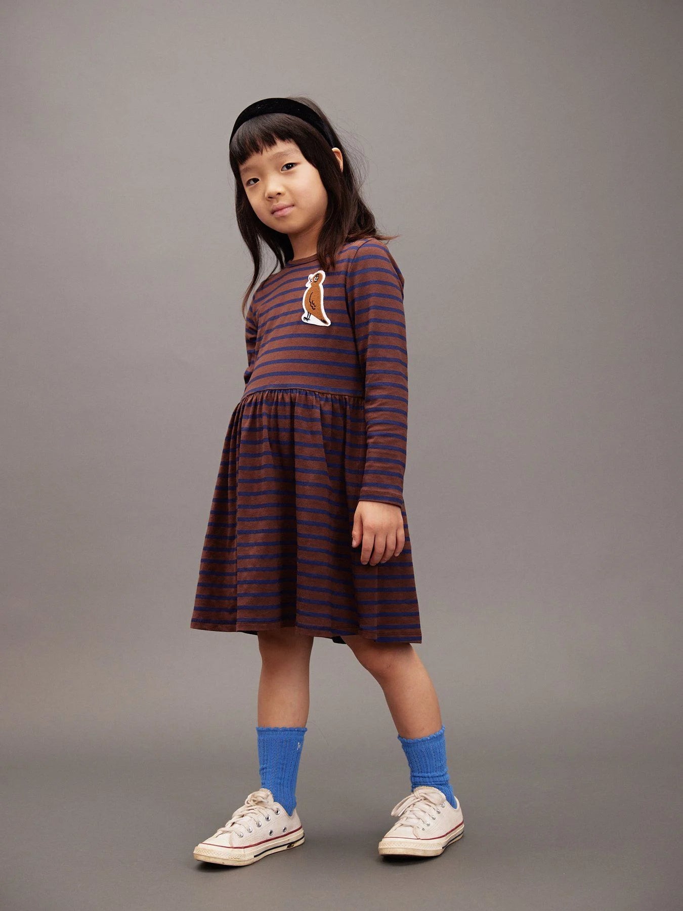 Long-sleeved dress with a ribbed round neckline, made from GOTS-certified organic cotton with a hint of stretch. Designed with a striped pattern and finished with a bird patch for extra style.