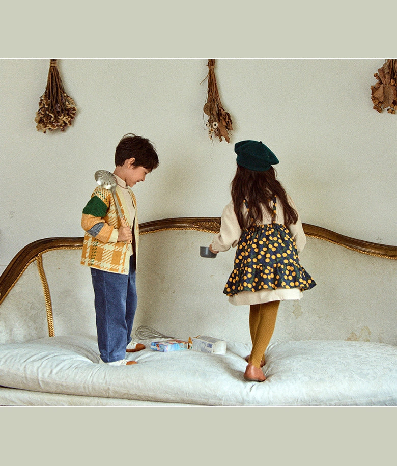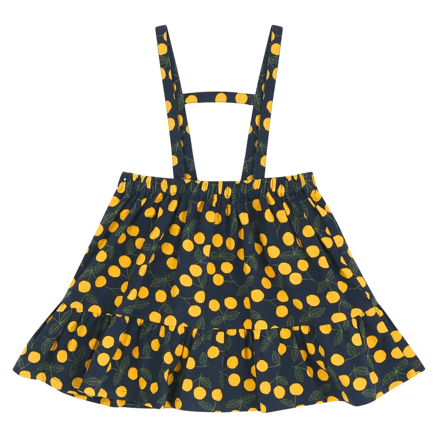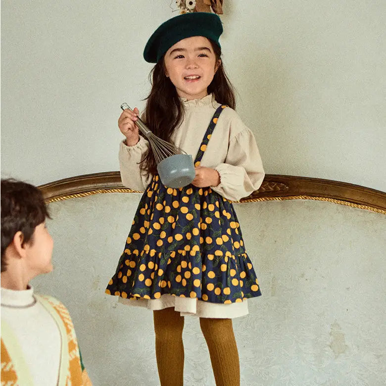 Add a splash of fun and color to your little one's wardrobe with this adorable dress & suspender skirt set featuring a playful fruit pattern. This charming set includes a long-sleeve ruffle neck dress and a fruit print suspender skirt that can be worn with other tops.