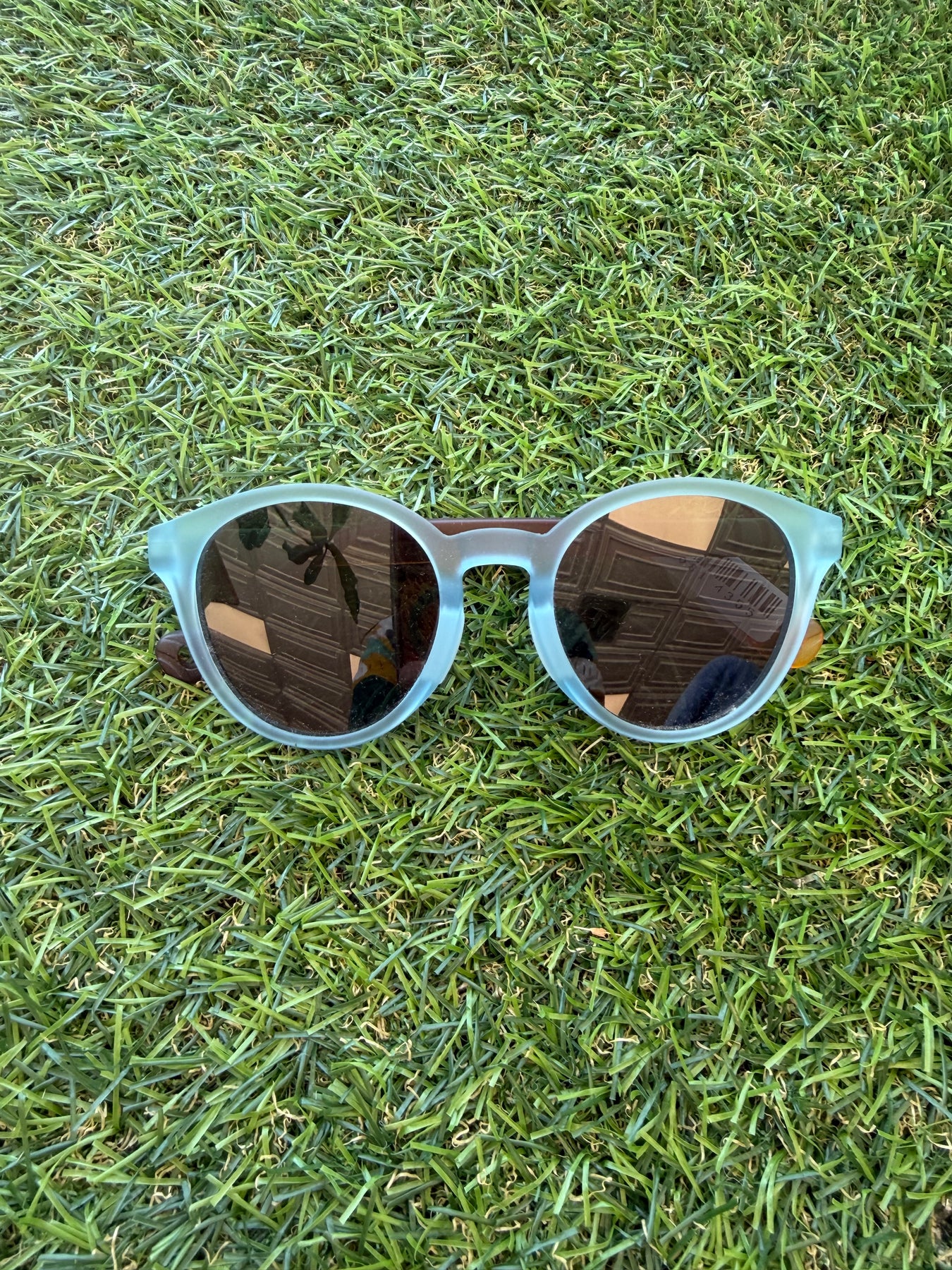 Easygoing style for sunny days. These round sunglasses feature soft matte frames in a cool sage green with dark tinted lenses. Lightweight and comfortable, they are made for playground adventures, park picnics, and long summer walks.