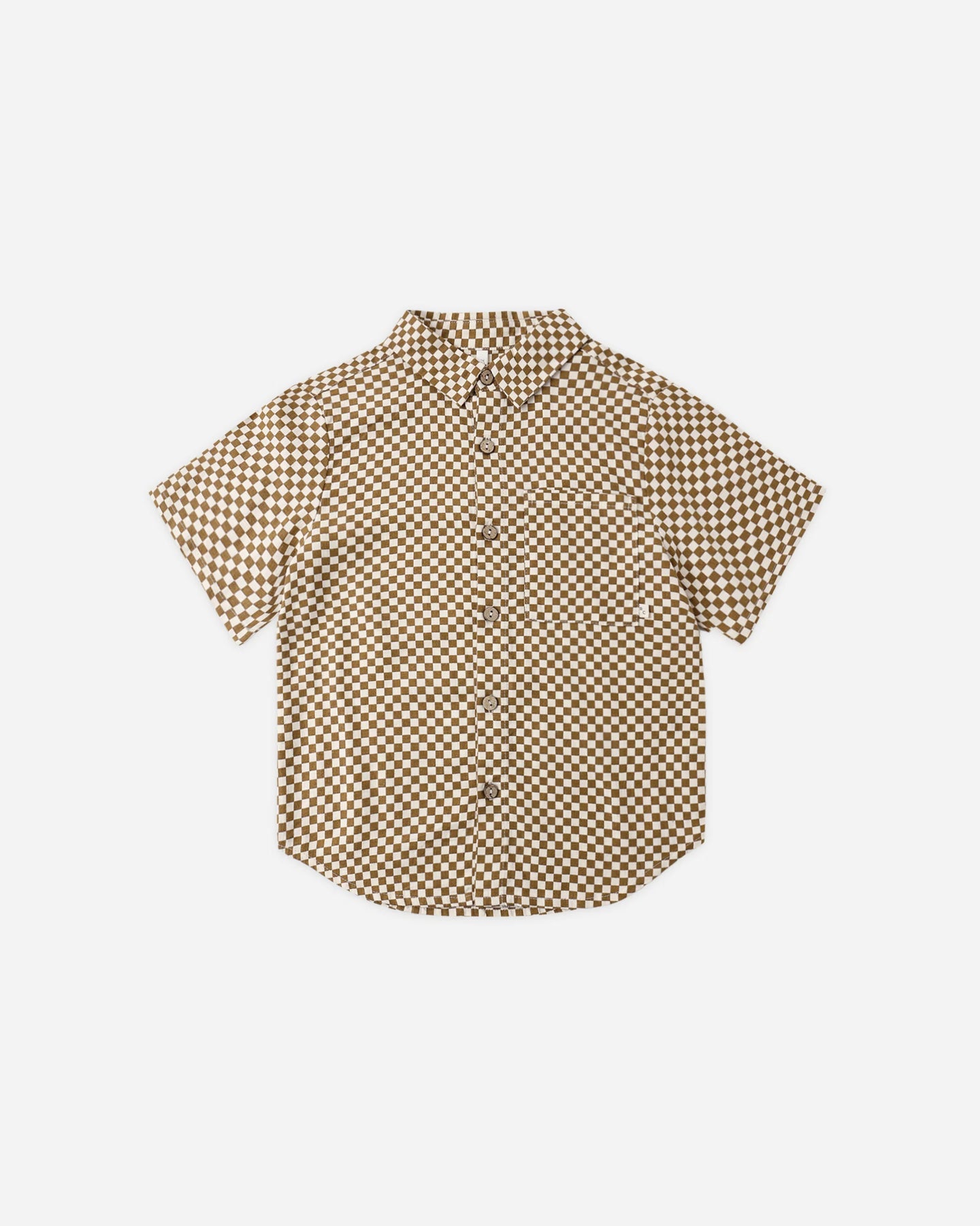 A classic collared boys short sleeve button-down shirt with coconut buttons.