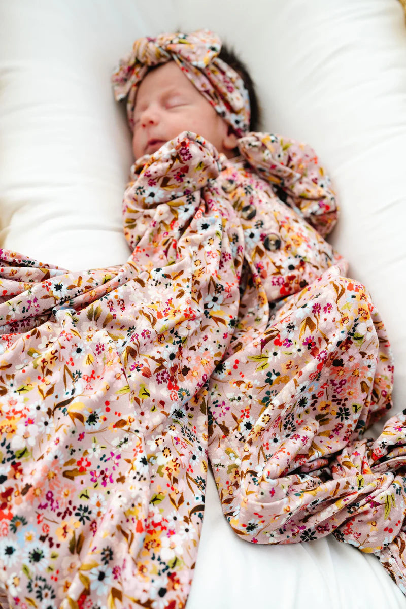 The easiest tie-bottom outfit for day or night. Made for hassle free diaper changes and gentle dressing, I designed this with a button-down front and tie bottom for simple closure (no more snaps at 2am!). Fold over wrist cuffs are the most thoughtful finishing touch.