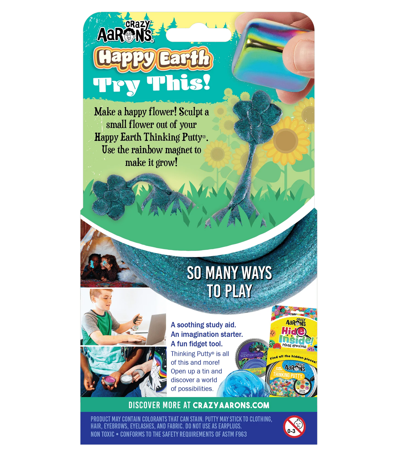 You’ll be a happy camper knowing our Thinking Putty® tins are made of food grade material that can be reused for crafts and projects or recycled with other metals like soup cans! When charged with the rainbow magnet, Happy Earth Thinking Putty® will gleefully dance around showing off its sparkling, mineral earth blue color.