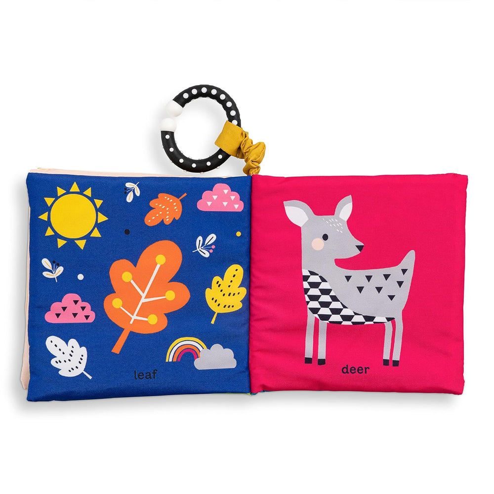 ntroduce babies and toddlers to the forest in this soft book with enticing crinkly pages. Through bright, colorful illustrations, little ones will learn first words like acorn, fox, and leaf while developing their senses and fine motor skills. Perfect for repeat readings (and crinkling!), this cloth book packaged with a teether is the ideal gift for any young child and caregiver.