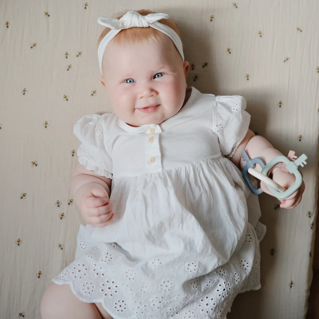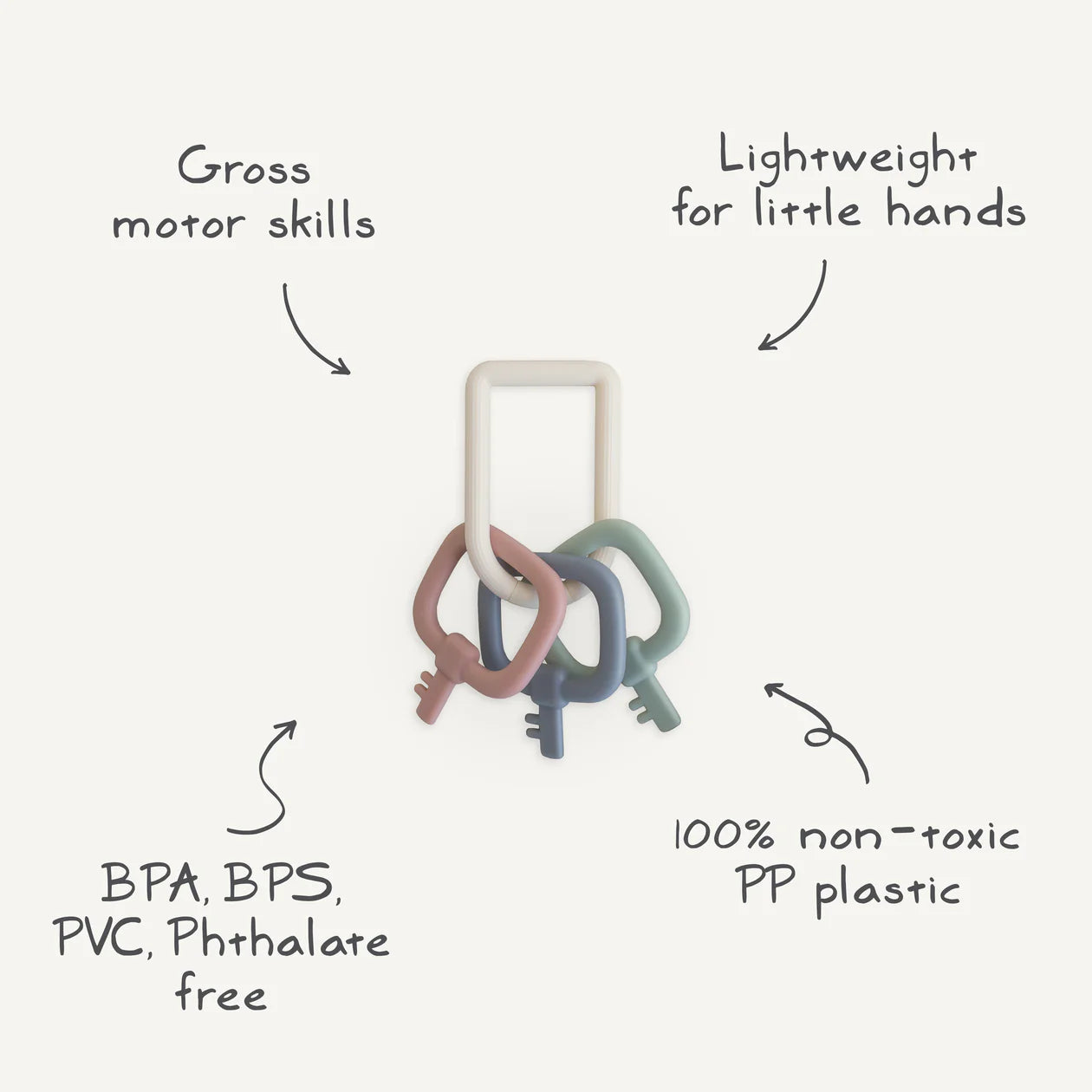 Unlock your little one’s imagination with our spin on a classic key toy reimagined in soothing colors. The lightweight key ring is easy for little hands to grasp and shake, making a gentle click-clack sound. Made of 100% non-toxic PP plastic that is easy to clean and gentle on teething gums.