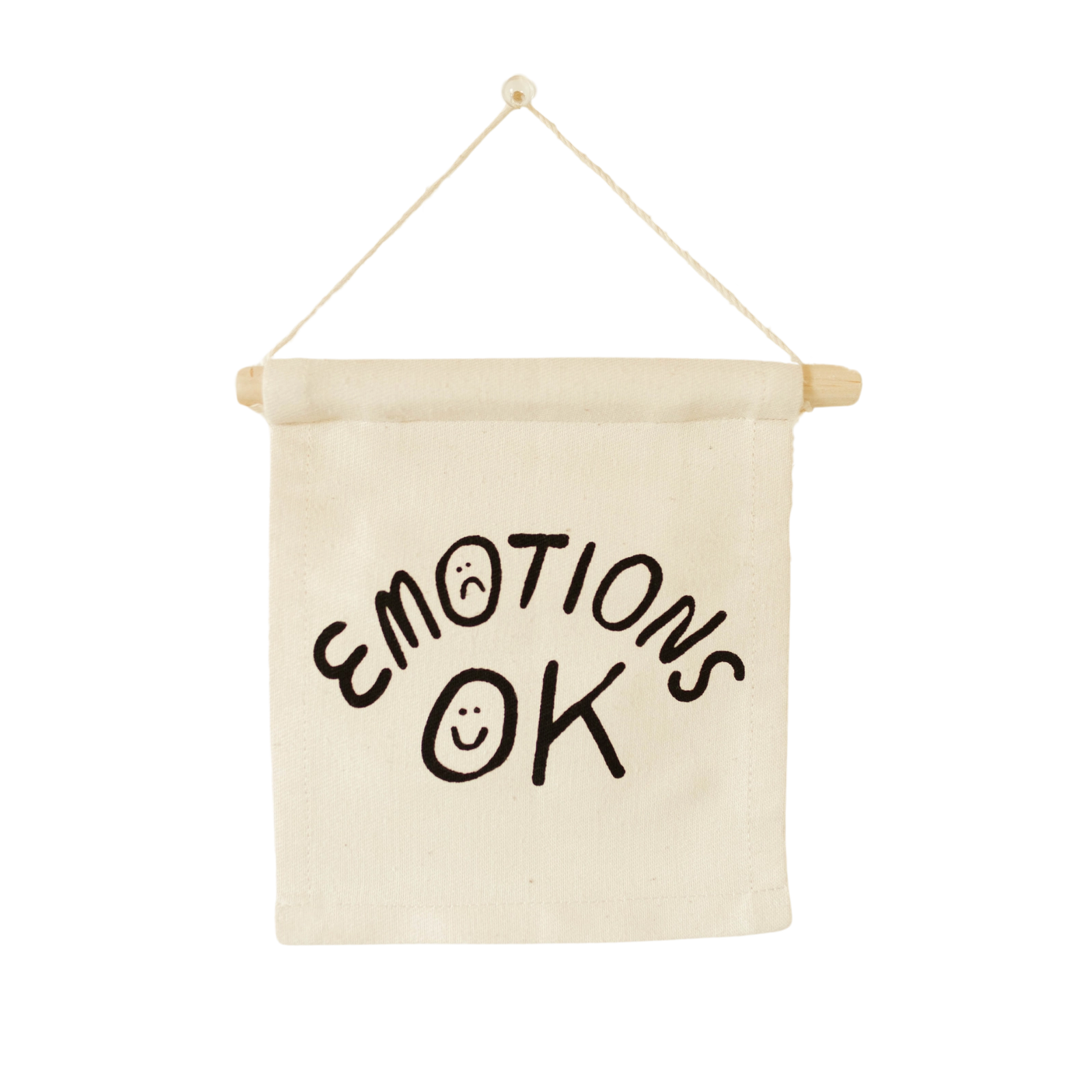 "Emotions OK" hang sign on natural canvas with a poplar wooden dowel. Sewn and screen printed by hand on natural canvas by empowered artisans in Mombasa, Kenya