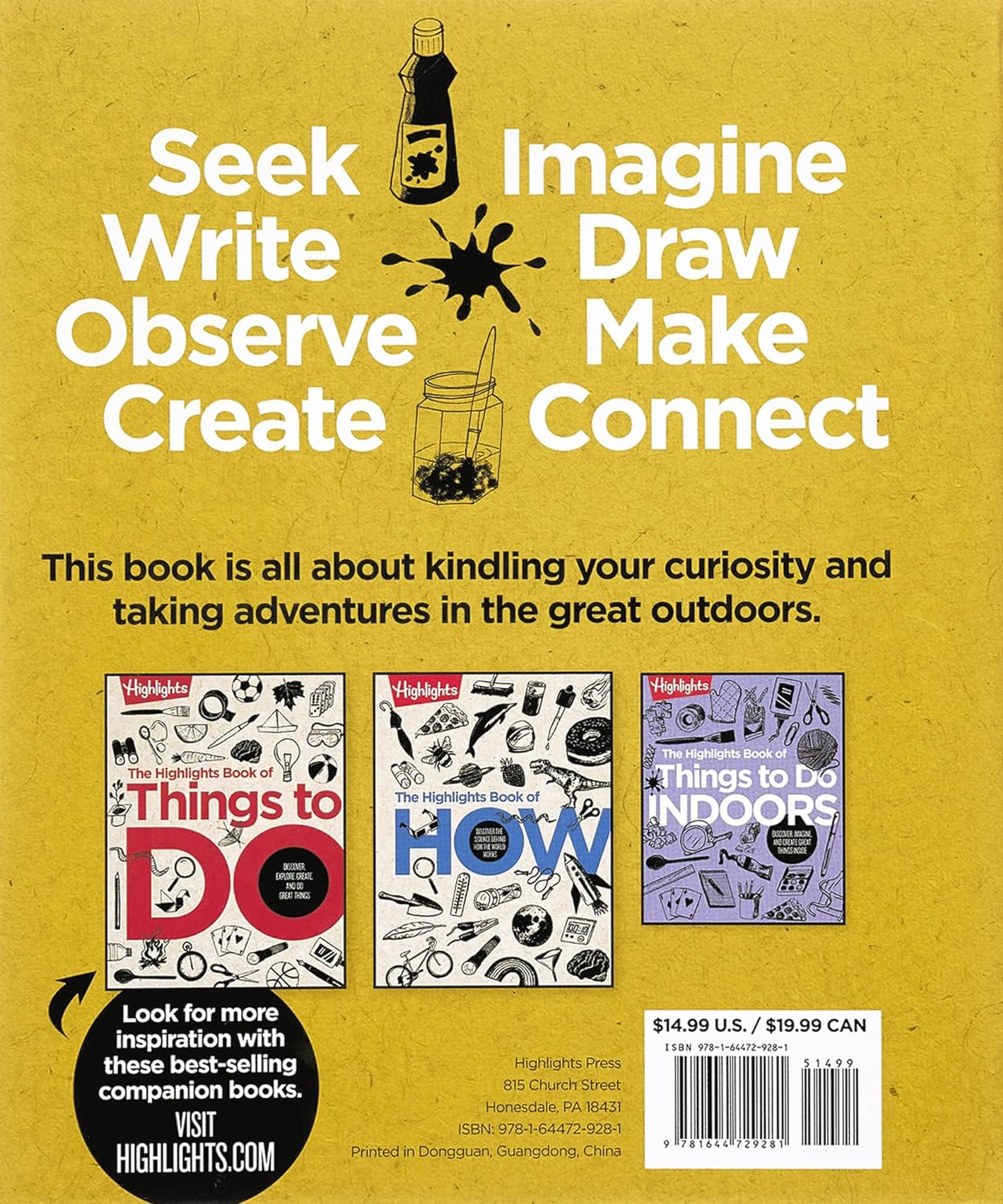 Get ready to explore—the sky’s the limit on outdoor adventure! Companion to the best-selling Highlights Book of Things to Do, this big book of outdoor activities features 160 captivating pages. Kids 7 and up will discover all kinds of ways to build, experiment, craft and help protect the planet, plus answers to countless nature-related questions.