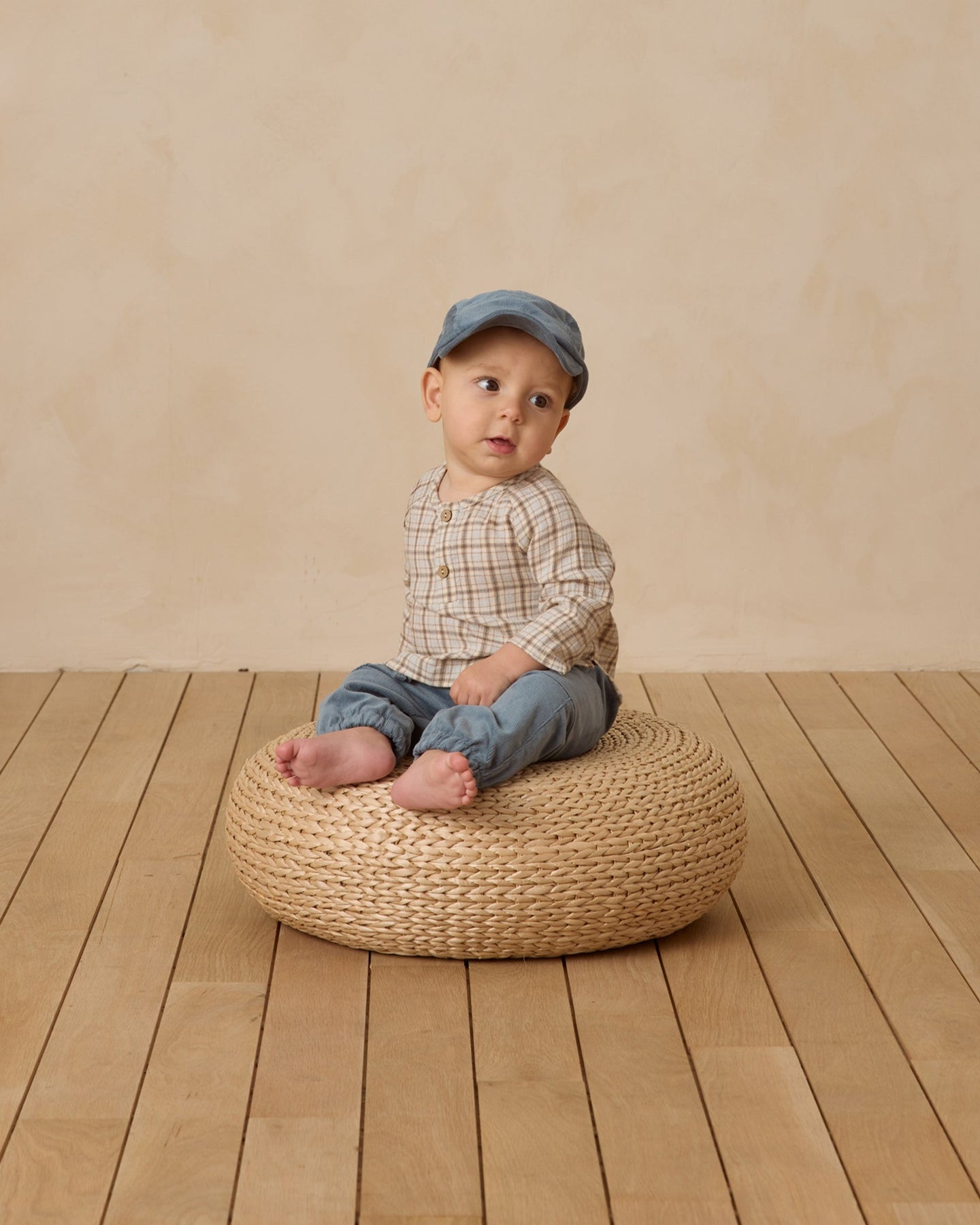 Comfortable corduroy pants with an elastic waistband and leg openings, adjustable drawstring, and side patch pockets.