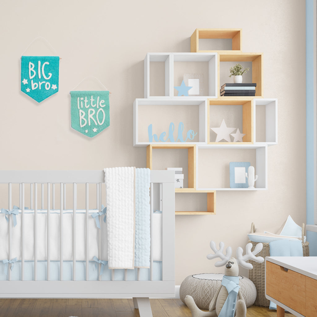 Celebrate the big bro with this adorable teal blue banner! The pennant flag is made of felted light aqua wool and finished with white felt lettering and stars to brighten the whole room. Hang this adorable piece of decor above the crib, among shelves on the wall, or on the door handle to greet visitors.