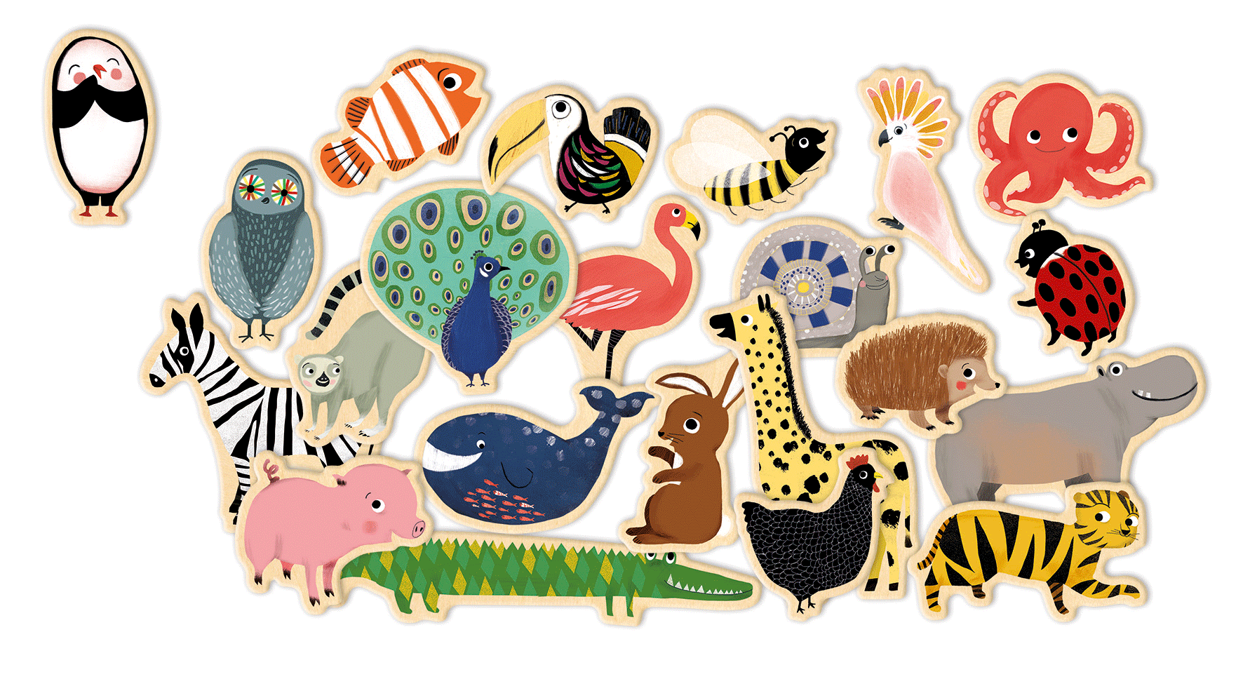 Funny animals, colorful letters, or zany mix and match, a box of wooden magnets transforms any metal surface into a child's playground! Imagine the circus, a farm,