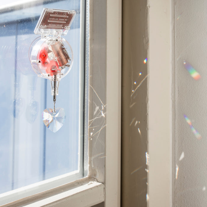 Attaches to window with suction cup or can be hung from top of window sill. Genuine heart-shaped Swarovski crystal rotates and refracts sunlight to create a swirl of rainbows.
