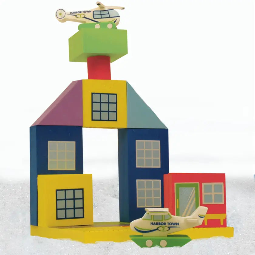 The BathBlocks Floating Airport set lets children build floating towns, bridges, towers and more in the bath. The seaplane and helicopter add action, fun and imaginative play to the floating playscapes.