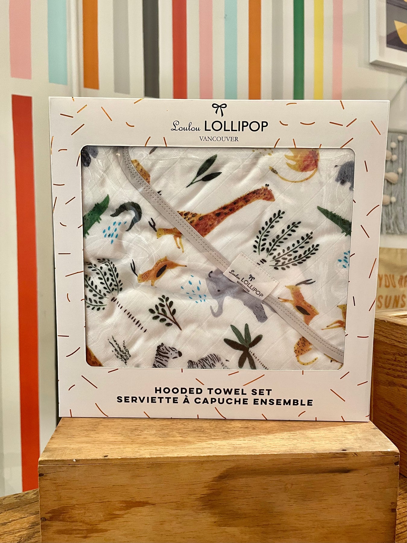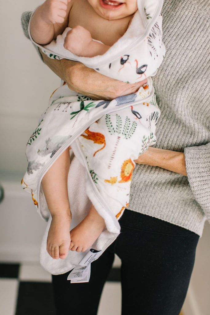 A fun pop of cuteness to add to your bath time routine! The hooded towel features an all over safari jungle print, while the reverse side is made of a soft, absorbent bamboo terry. Set comes with a coordinating washcloth.