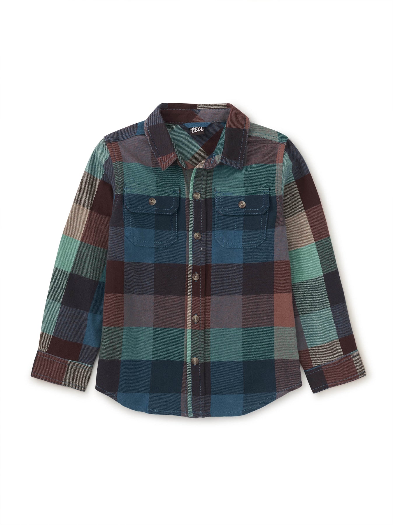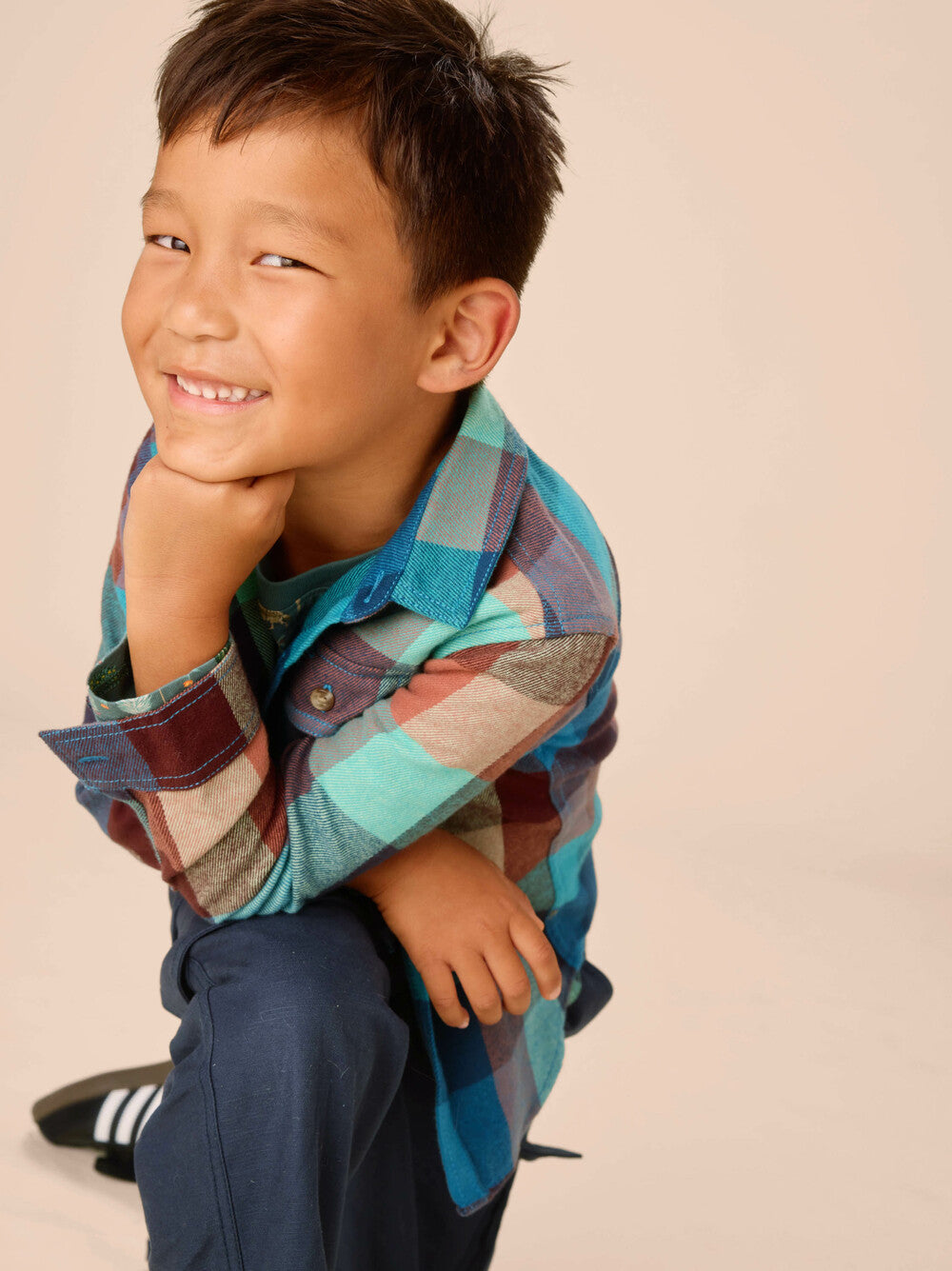 Plaid and winter go together like cookies and milk. So cozy and a little dressy, this winter-friendly button-up pairs perfectly with fan-favorite Playwear Jeggings and joggers. Chest patch pocket. Crafted from 100% cotton, our durable tees maintain their color and shape, wash after wash. Thigh length.