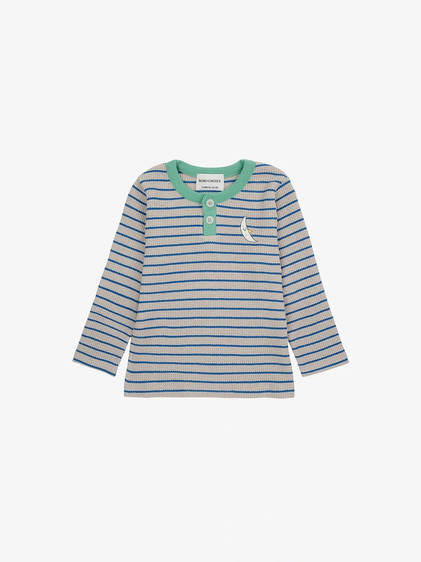 We want to stimulate the imagination and curiosity of the little ones with fun garments like our blue striped baby t-shirt. It features a half moon surrounded by stars for them to create their own stories and explore the universe around them. The little ones can move freely during their indoor or outdoor playtime.