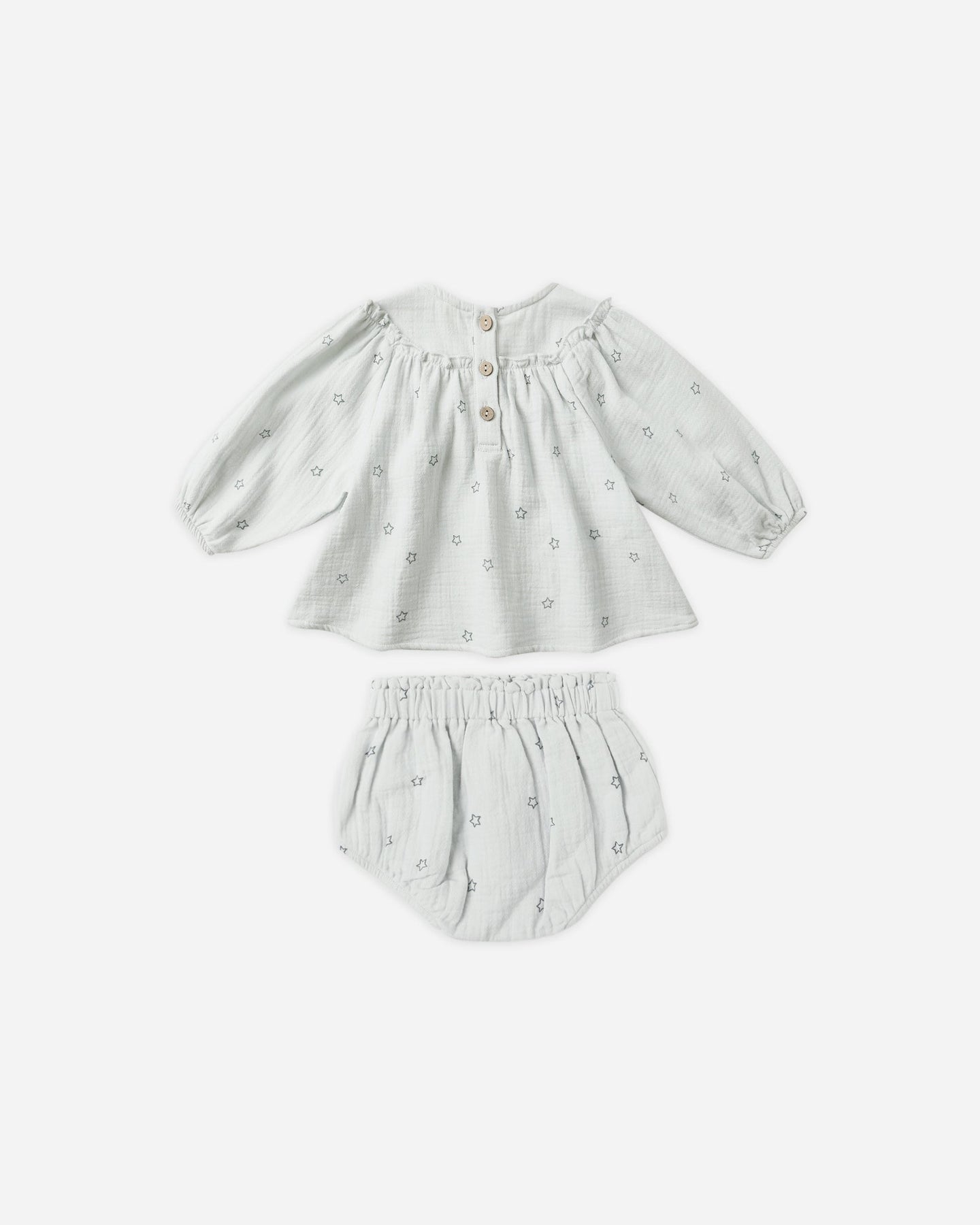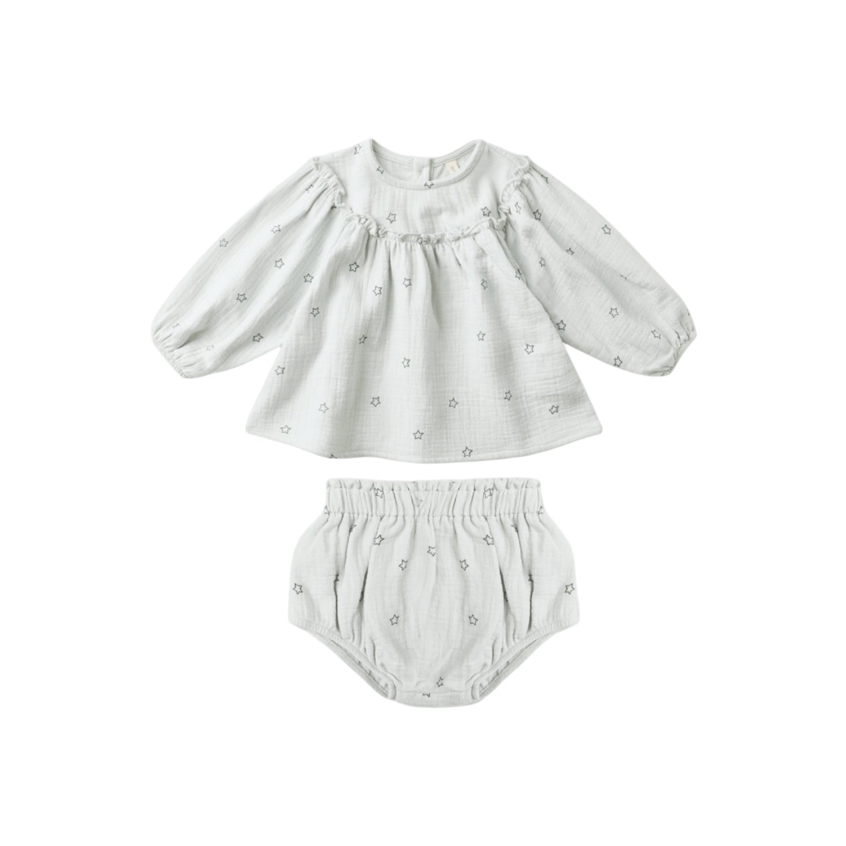 This darling set features a full gathered blouse with delicate ruffle detail, balloon sleeves, and a button-back closure, paired with matching bloomers for the perfect finishing touch. A timeless, must-have addition to your little one’s wardrobe.