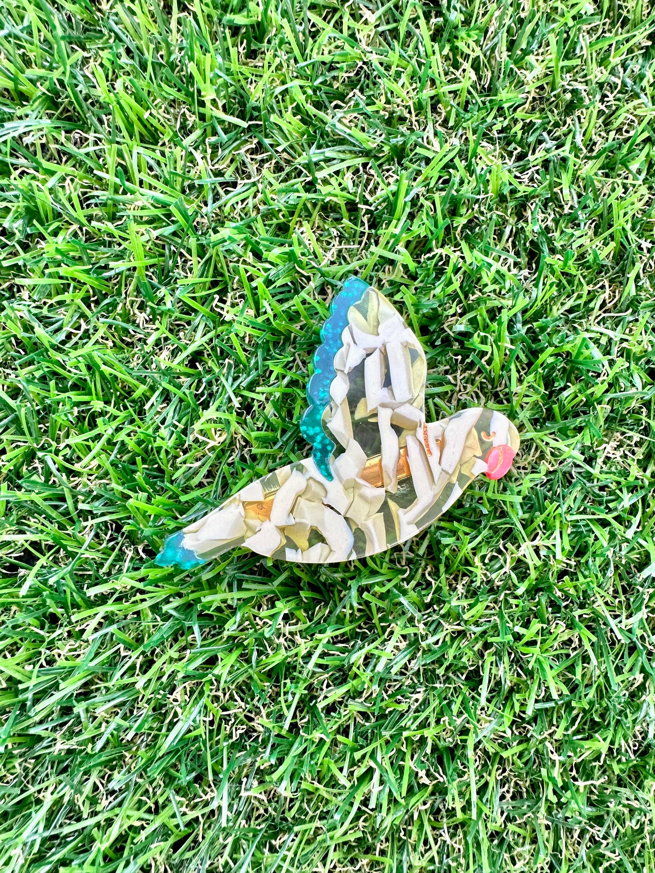 Beautiful semi-transparent hair clip.  Alligator closure.  Measures about 2.5" across.