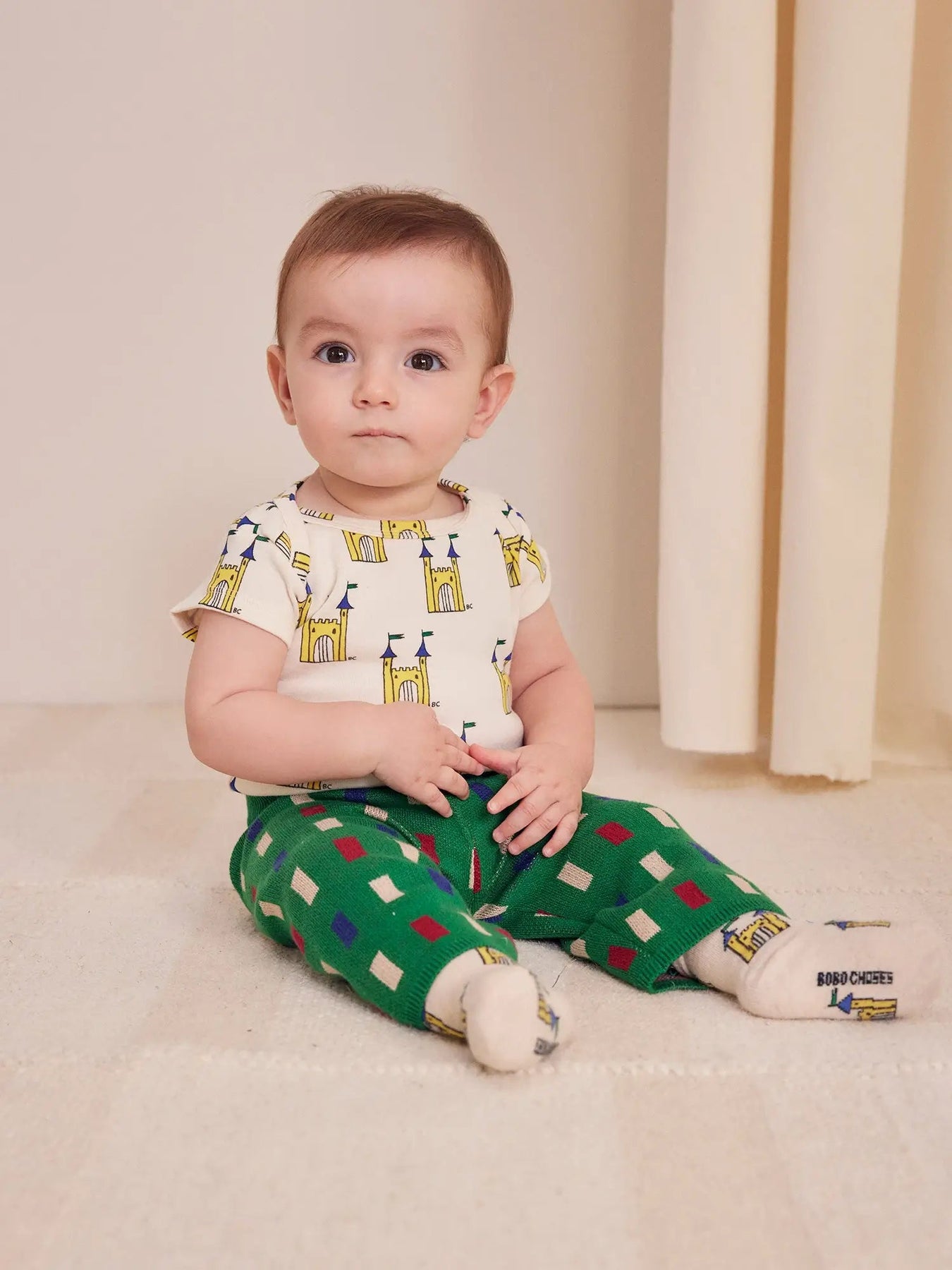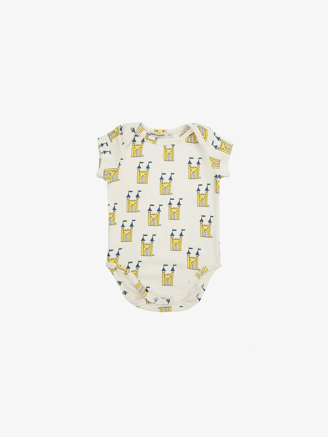 The "Faraway Castle" bodysuit in off-white for babies features a print full of castles with tall towers and fluttering flags. The design is inspired by the tales of the Brothers Grimm, brimming with enchanted landscapes, magic, and adventures. Create playful outfits with it, radiating personality wherever they go.