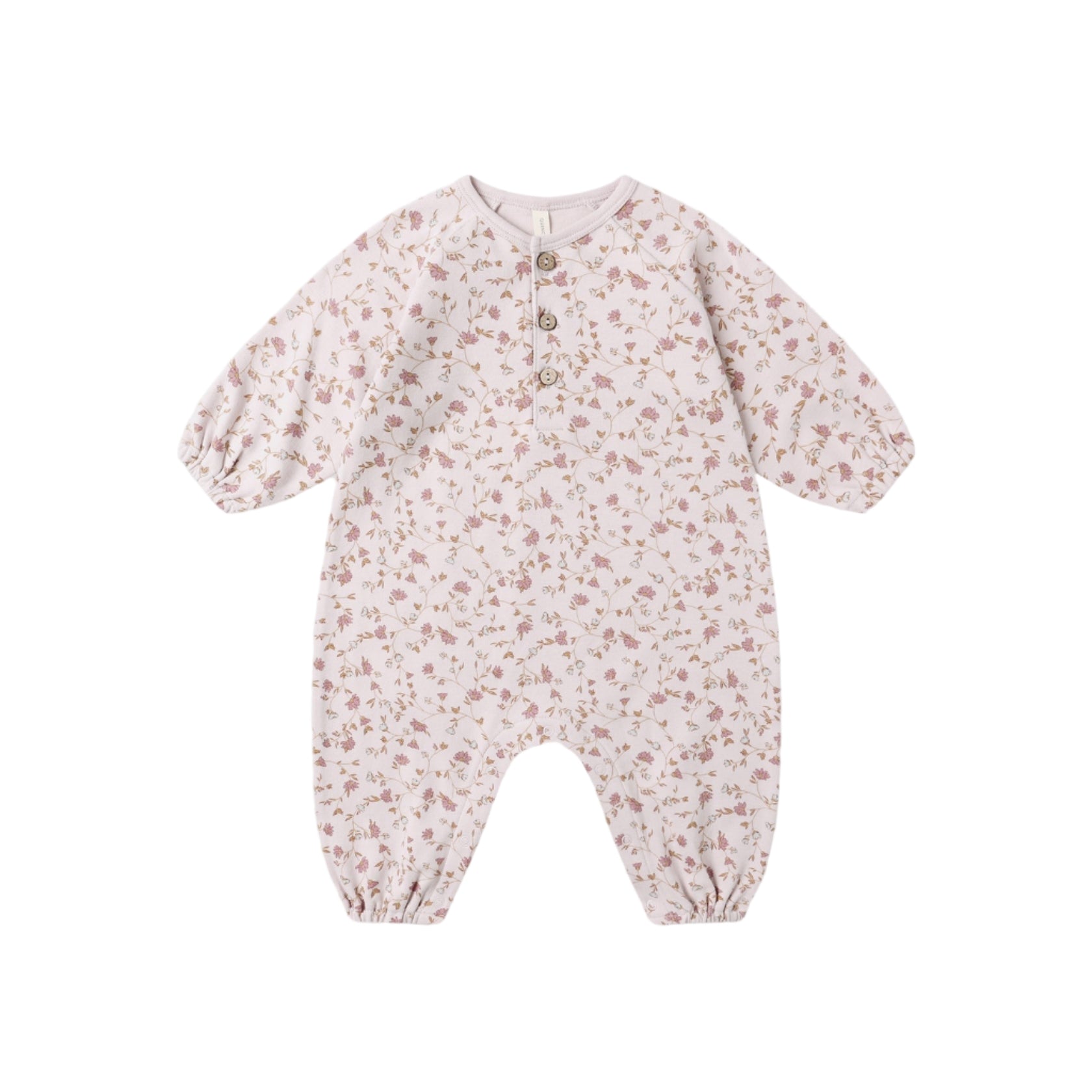This long sleeve jumpsuit features a coconut button placket and elasticized sleeve and leg openings for a darling bubbled silhouette. Snaps along the inseam make for easy changes.