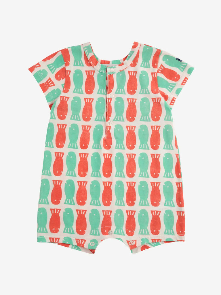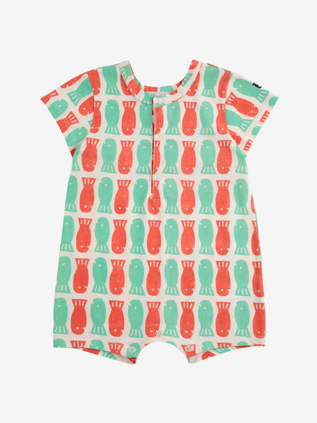 Understated and elegant, this offwhite playsuit is designed for all-day comfort. Made from 100% organic cotton, it features short sleeves, a dropped shoulder, and a loose fit with a relaxed crotch. Front and crotch snap fastenings ensure ease of wear, while embroidery details add a charming finish. Responsibly crafted in Spain.