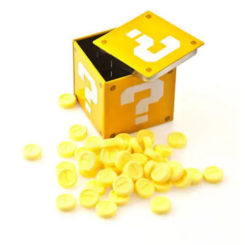 Power up! Each Question Mark Box shaped tin is filled with 1.2 ounces of strawberry coin-shaped sours. For all the little Mario fans in your life. Each tin sold individually.
