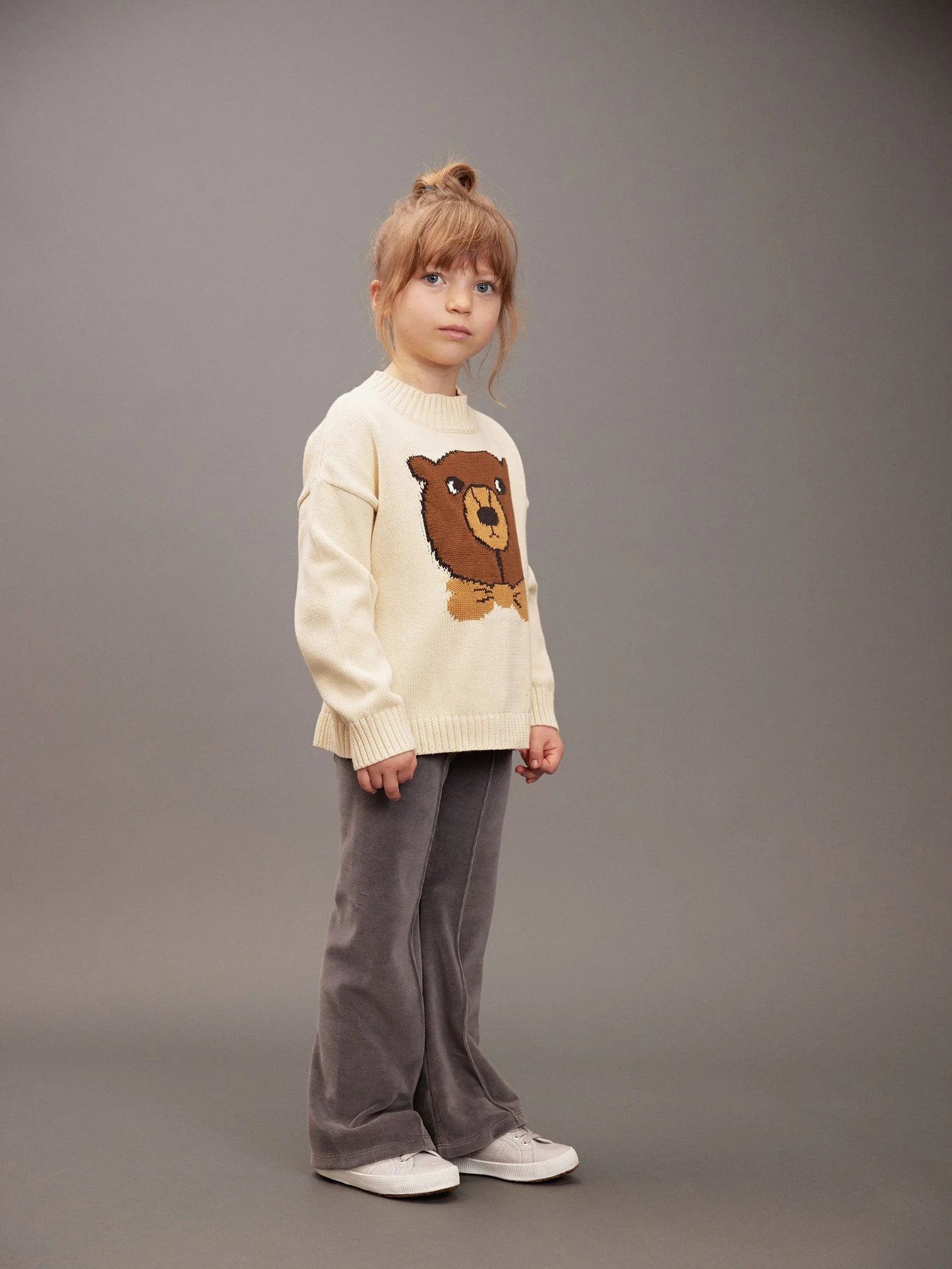Soft knitted sweater made from 100% GOTS-certified organic cotton. Features a relaxed fit and a playful bear intarsia at front. Designed with ribbed trims at neck, cuffs, and hem.