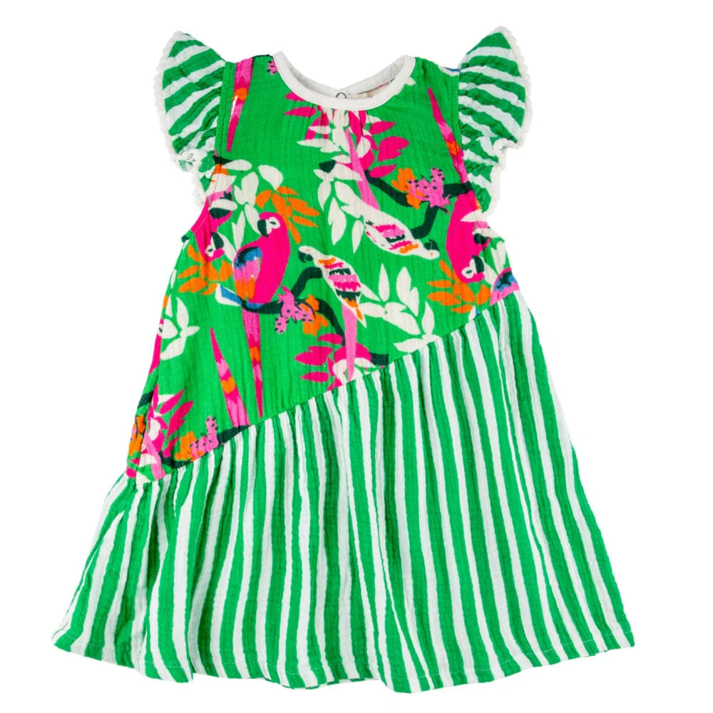 With bright, bold colors, Miki Miette's Lia dress in their Rio pattern is sure to impress your little one. This dress features asymmetrical stripes, ruffle sleeves, and a few fun parrots. It's a great dress for any activity from school to Saturday play dates.
