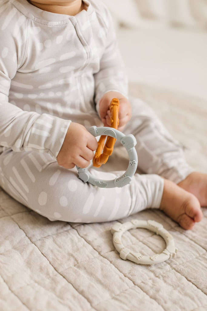 A set of 3 teething rings for your little one to chew on to help soothe irritated and sore gums. These rings come in a sleek and modern design with a satisfying texture on each.
